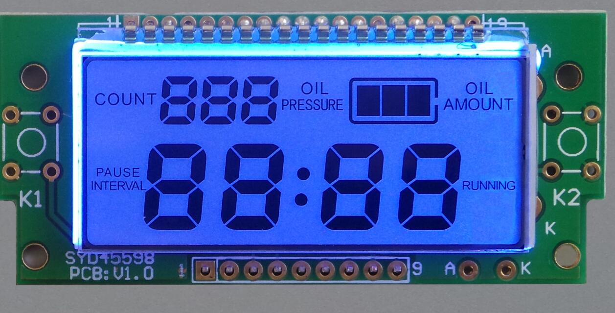 上圖所示為帶背光源的一種定制段碼顯示模組,這是一種根據(jù)客戶要求來(lái)定制的模組,它是由一個(gè)線路板,IC,背光源,LCD液晶屏組成,主要應(yīng)用于潤(rùn)滑系統(tǒng)上面。